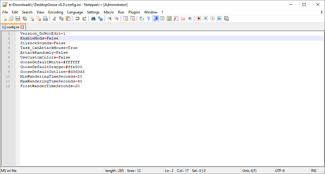 Несмотря на отсутствие графического интерфейса, у Desktop Goose есть настройки, описанные в конфигурационном файле config.ini. Это: