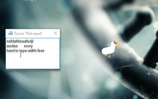 Животное бегает по рабочему столу поверх всех окон, откидывая тень, оставляя грязные следы и периодически покрикивая. Для отвлечения пользователя от рутины гусь порой вытаскивает на экран приготовленные заранее графические файлы (картинки) или блокнот с надписями – заметками.